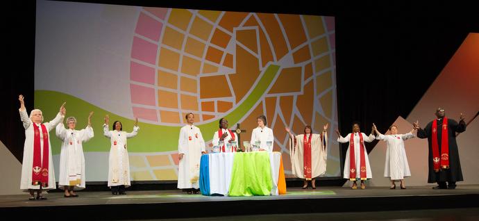 Les évêques président un culte de Sainte Cène lors du culte de clôture de l'assemblée. Photo de Mike DuBose, UMNS.